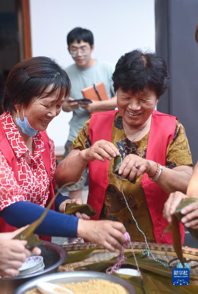 6月7日,在安华镇球山村的爱心食堂里,志愿者在包粽子。