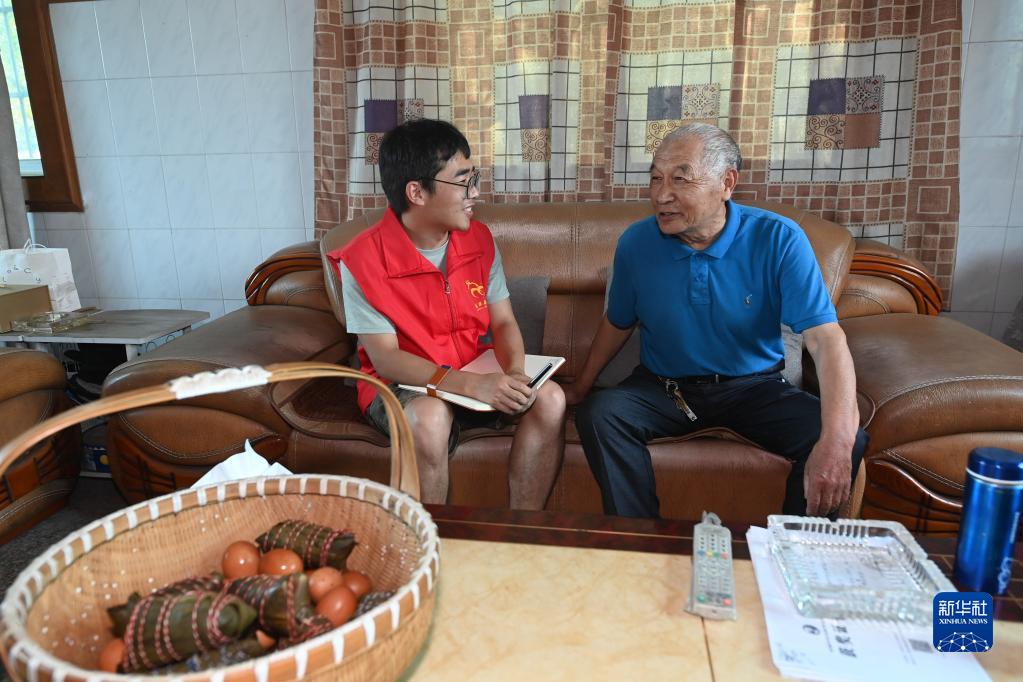 6月7日,安华镇的青年志愿者与球山村81岁的独居老人许仲鲁(右)聊天,收集和记录民情实际、民生需求。