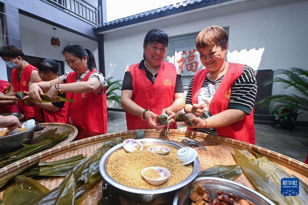 6月7日,在安华镇球山村的爱心食堂里,志愿者在包粽子。