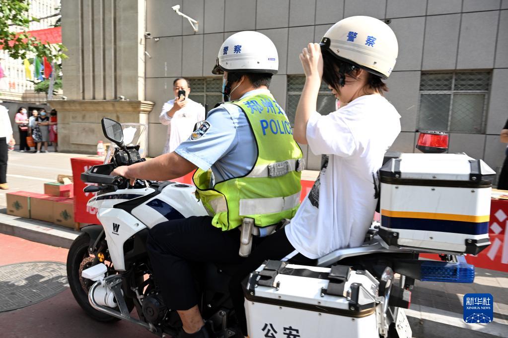 6月7日,在河南省郑州市黄河科技学院附属中学考点,警察送考生赶赴她的考点。
