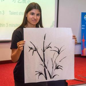 6月6日,在塞浦路斯首都尼科西亚,来自塞浦路斯大学的迪亚娜·伊万诺娃在“汉语桥”世界大学生中文比赛塞浦路斯赛区决赛上展示才艺作品。她最终获得本次比赛的冠军。