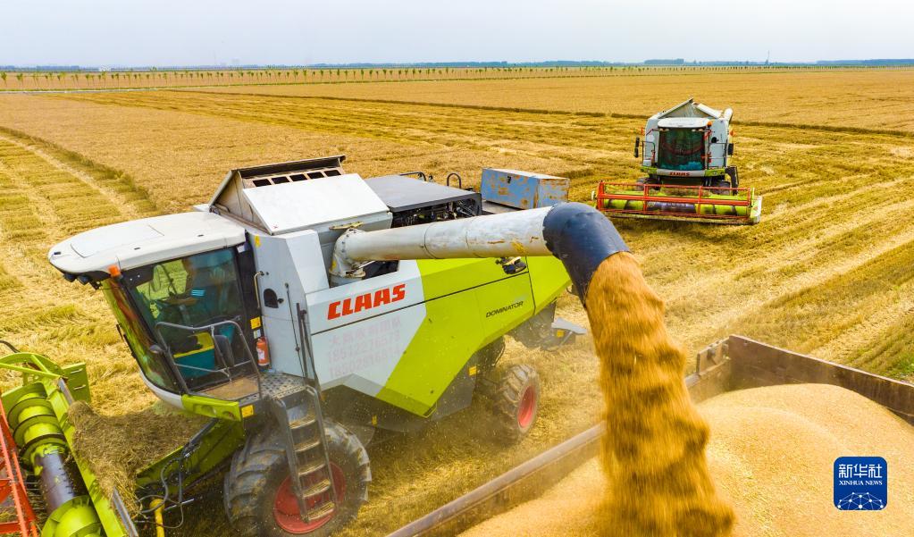 “三夏”时节,在河南省驻马店市西平县老王坡高标准农田,农机手操作大型收割机收割小麦,田间地头一派忙碌景象。