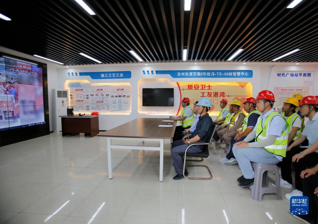 6月7日,在苏州轨道交通8号线时代广场站建设工地,建筑工人参加安全生产警示教育活动。