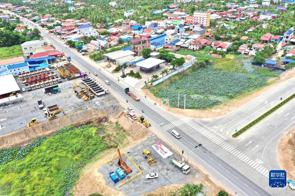 这是6月5日在柬埔寨干丹省拍摄的高速公路施工起点(无人机照片)。