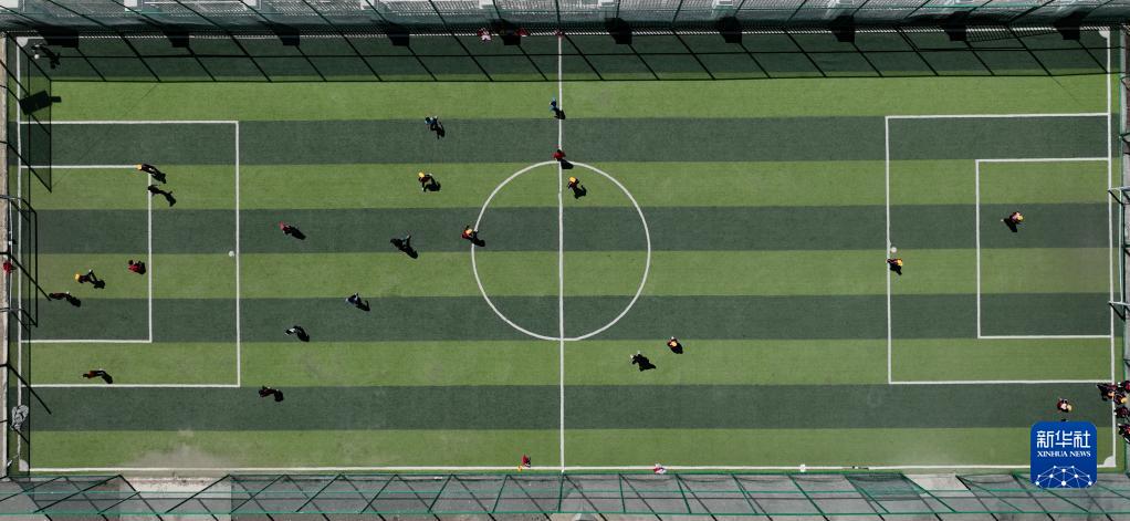 扎西宗乡完全小学的学生在体育课上踢足球(6月5日摄,无人机照片)。新华社记者 晋美多吉 摄