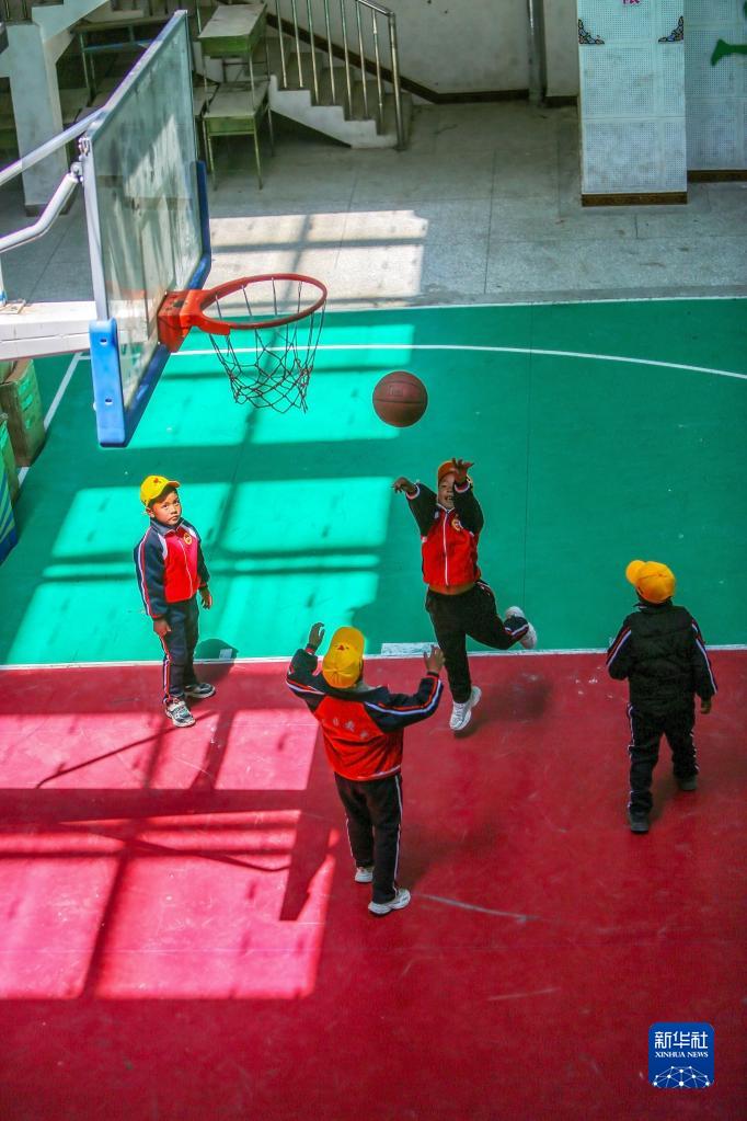 6月5日,扎西宗乡完全小学学生在篮球课上投篮。新华社记者 邵泽东 摄