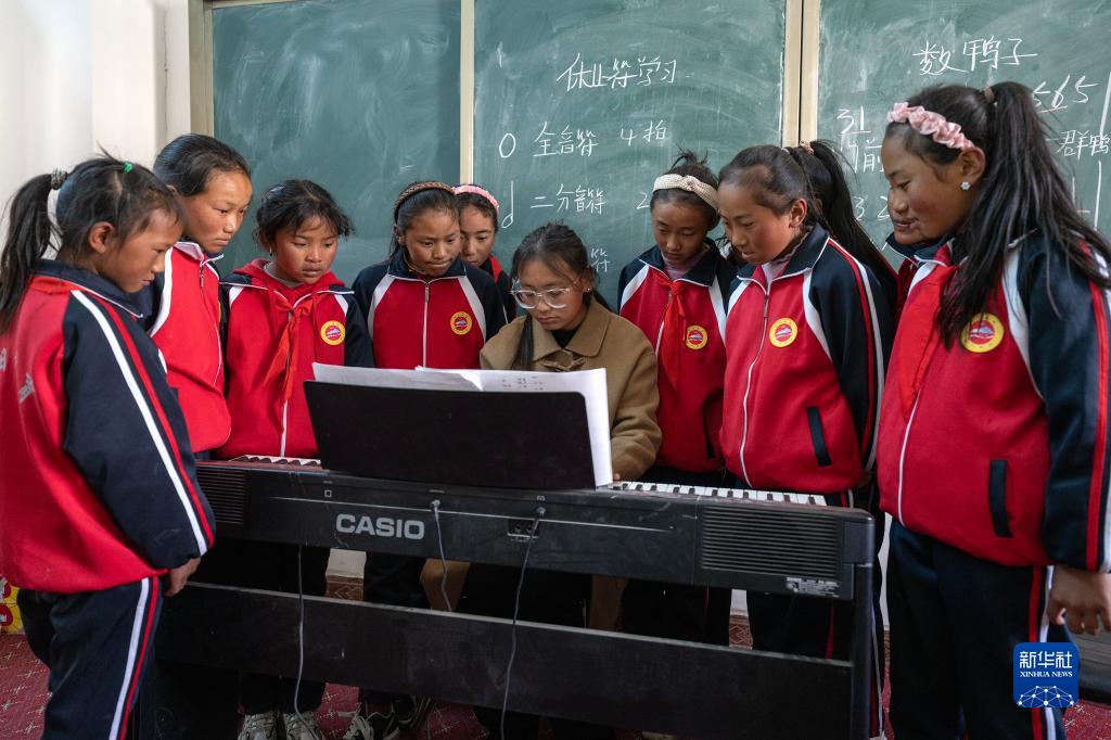 6月5日,钢琴课老师巴桑(中)在教旦增吉宗(前右二)和其他同学乐曲《我的家在日喀则》。新华社记者 费茂华 摄