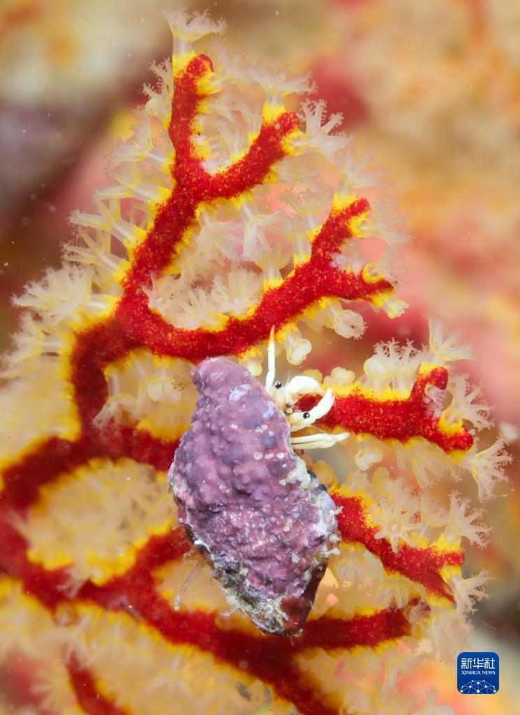 在分界洲岛附近海域,一只寄居蟹在珊瑚上爬行(5月25日摄)。
