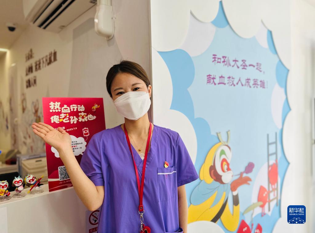6月8日,“热血悟空”主题献血屋的采血护士在介绍献血屋内的特色墙绘和装饰。