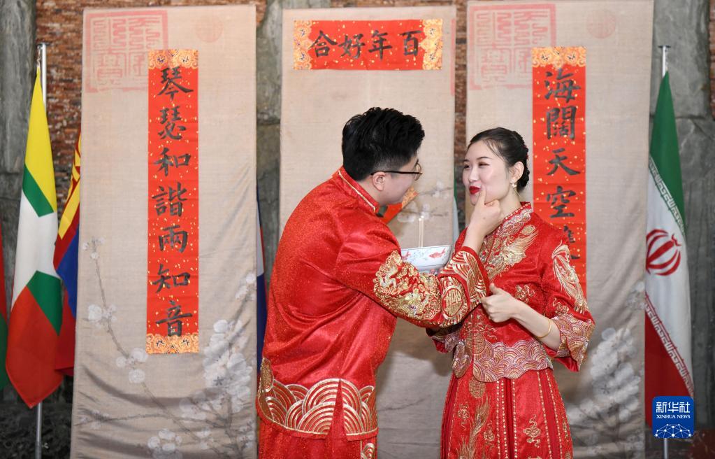 6月7日,在瑞士日内瓦,中国常驻联合国日内瓦办事处和瑞士其他国际组织代表团的新郎齐林和新娘张秋若在以亚洲婚俗文化为主题的第三届日内瓦“亚洲文化节”上举办中式婚礼。
