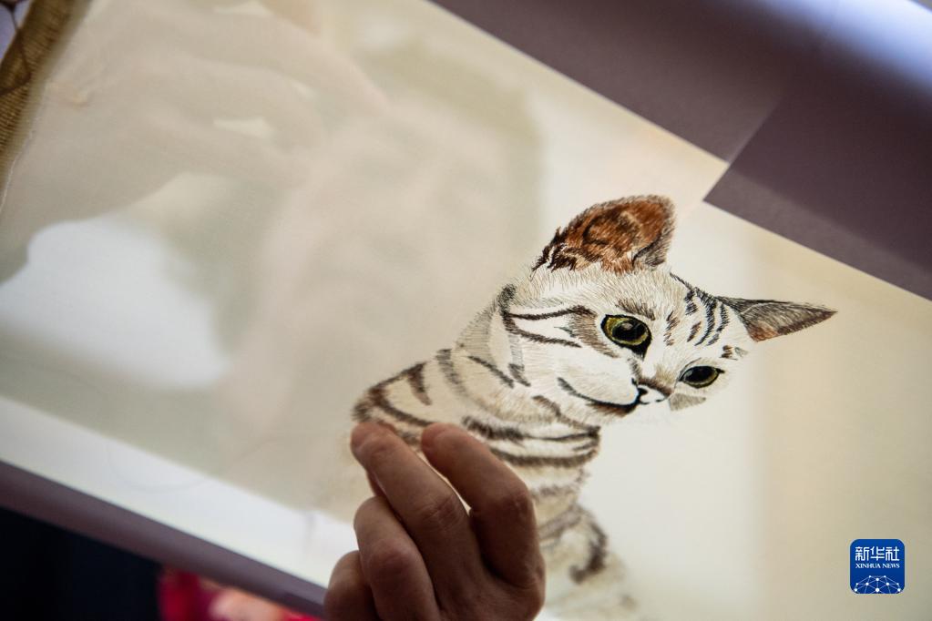 在重庆市渝中区的重庆渝康宁蜀绣艺术研究院,康宁在刺绣(5月12日摄)。