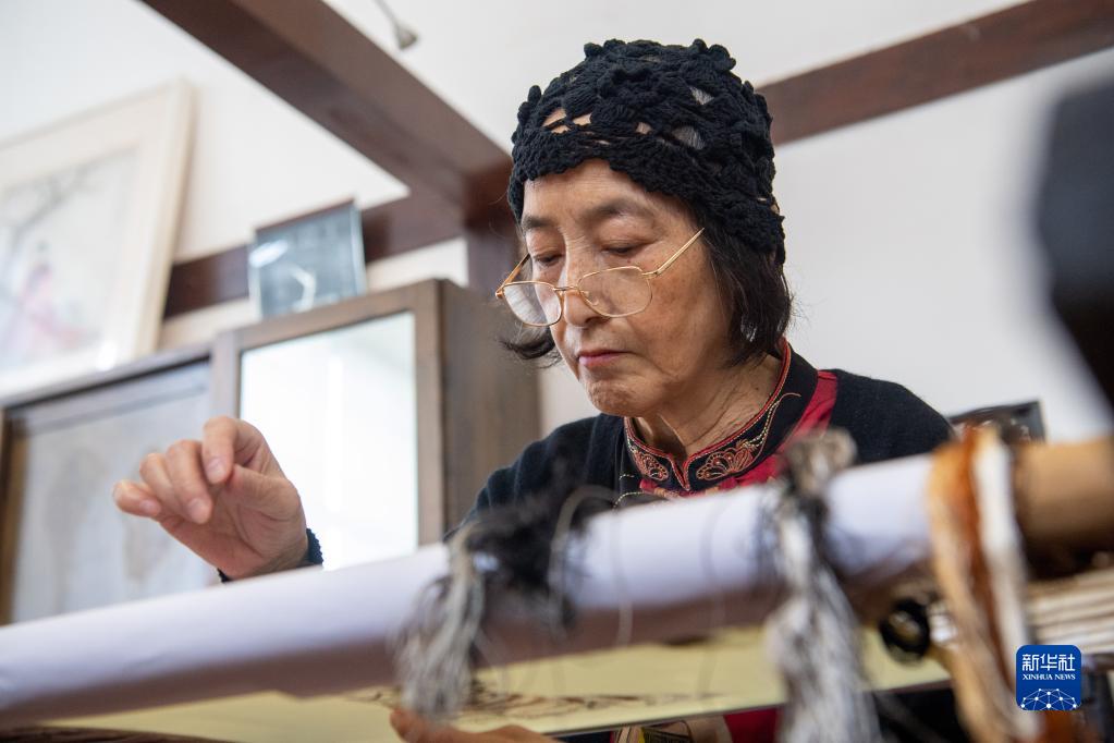 在重庆市渝中区的重庆渝康宁蜀绣艺术研究院,康宁在刺绣(5月12日摄)。