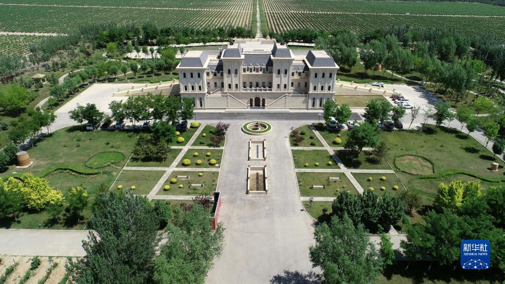 这是位于贺兰山脚下的美贺庄园(6月8日摄,无人机照片)。