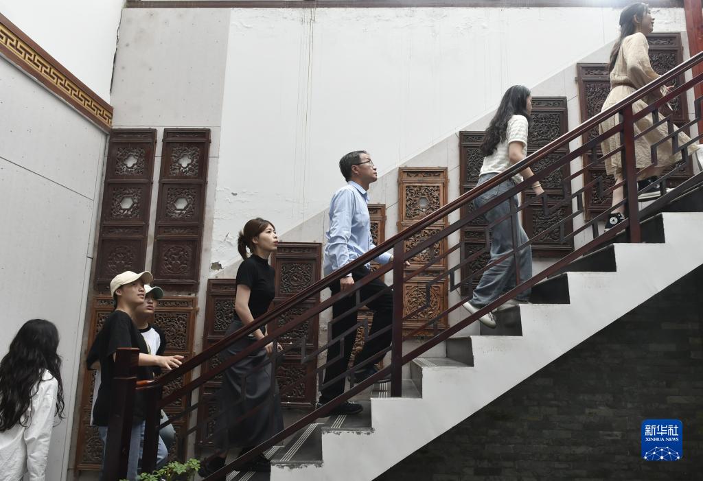 6月7日,张俊涛(右三)在开封市“汴京灯笼张”彩灯展览馆内带领来访的大学生们参观。