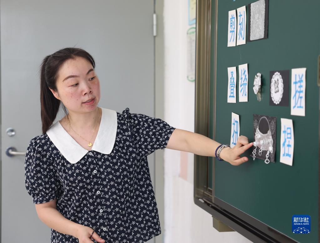 6月9日,湖南省长沙市朝阳小学王晓风老师在特色美育课上向学生们介绍制作技艺。