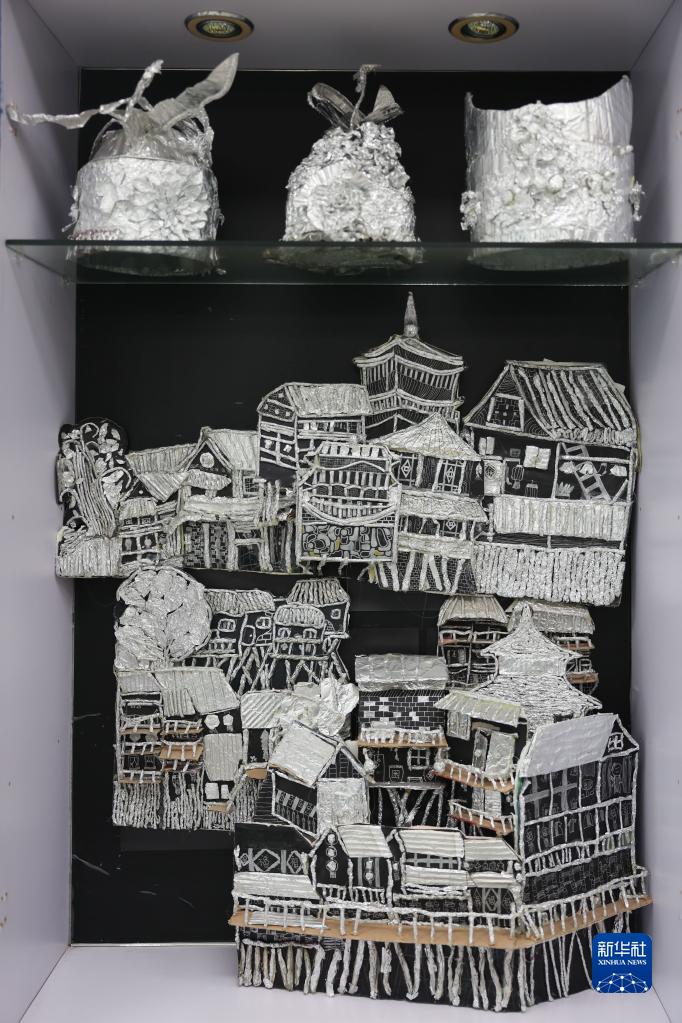 这是6月9日在湖南省长沙市朝阳小学拍摄的有苗族银饰特色的学生手工作品。