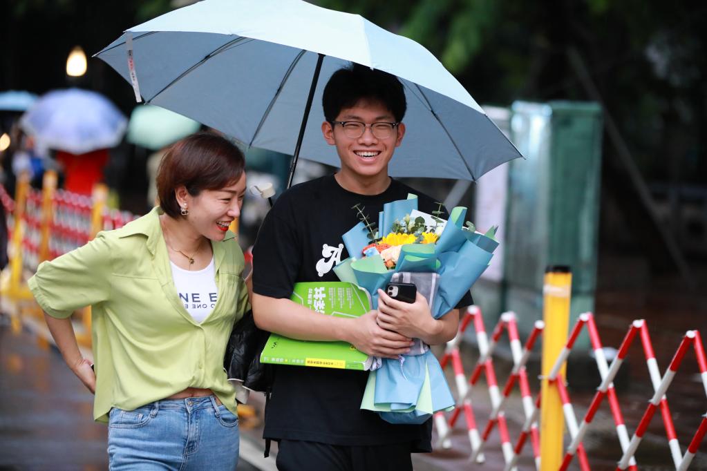 6月9日,在福州第十一中学考点外,考生(右)手捧鲜花回家。