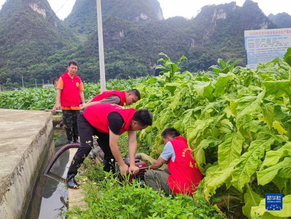 6月6日,广西德保县燕峒乡党员先锋队在太平烟叶基地抽水浇灌烟田。