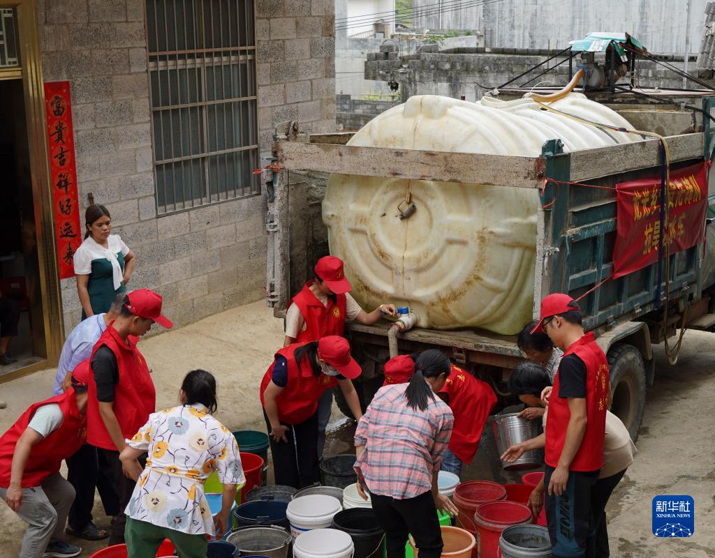 6月6日,在广西德保县龙光乡那练村,党员先锋队为缺水村屯送水。
