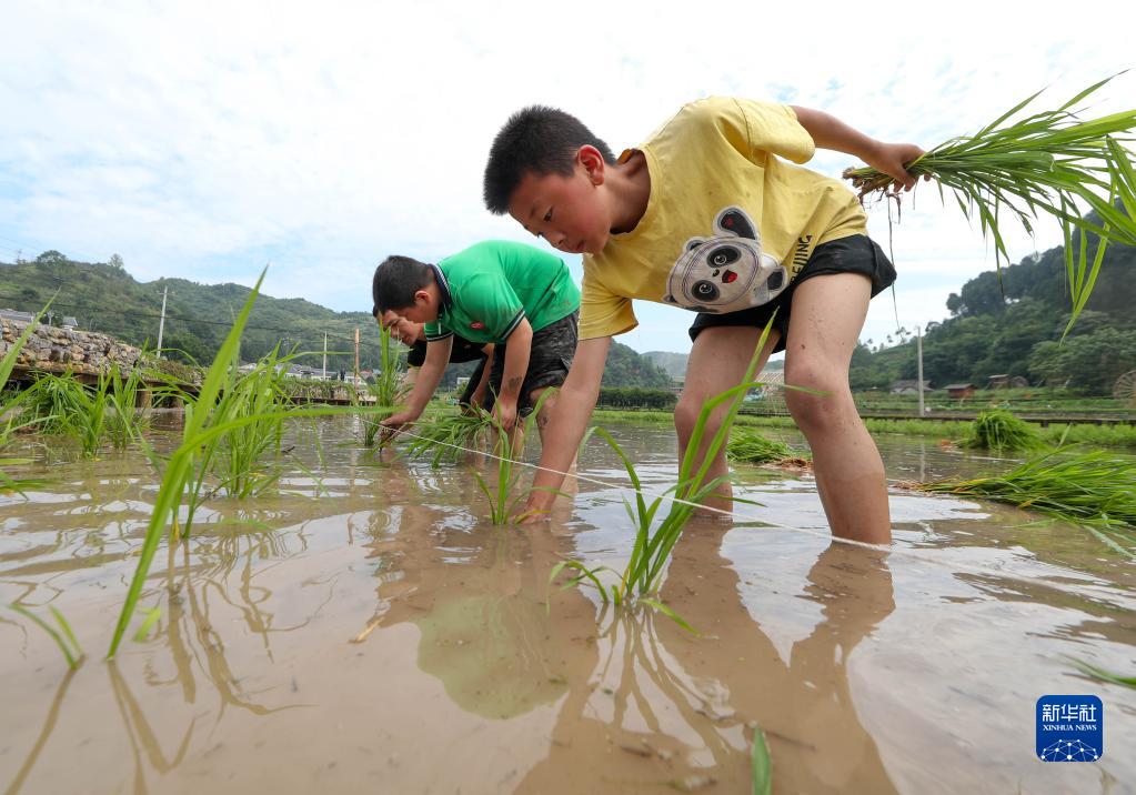 6月9日,学生在贵州省绥阳县中小学劳动教育综合实践基地体验插秧。