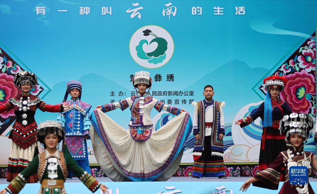 6月9日,模特在云南省楚雄市彝人古镇活动现场展示刺绣服饰。