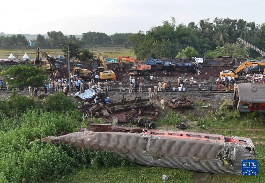 6月4日,救援人员在印度奥迪沙邦巴拉索尔地区的列车脱轨相撞事故现场工作。