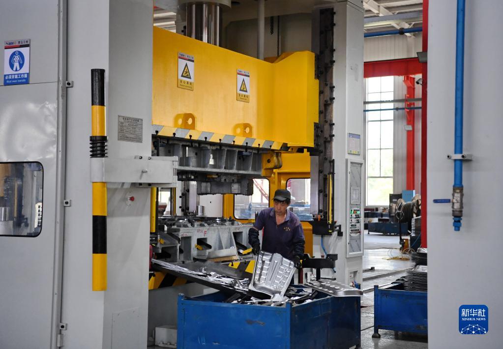 6月9日,在位于河北沧州南皮县的河北赛格机电有限责任公司,工人在冲压生产线上工作。