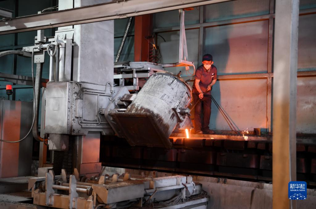 6月9日,河北沧州泊头市亚奇铸业有限公司工人在进行浇铸作业。