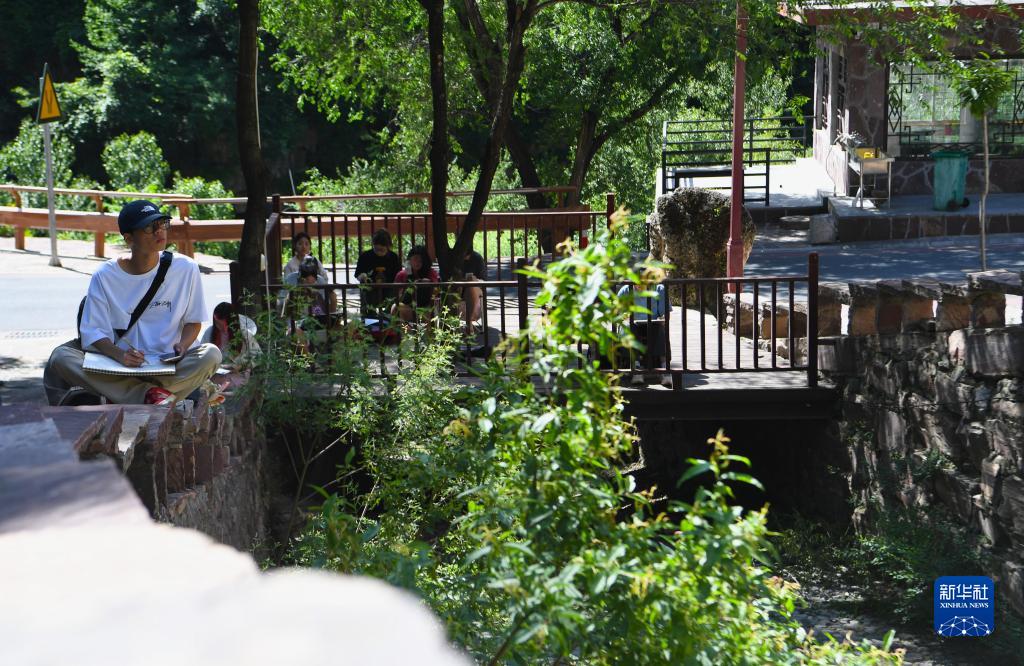 6月9日,学生在河南安阳林州市石板岩镇三亩地村写生。