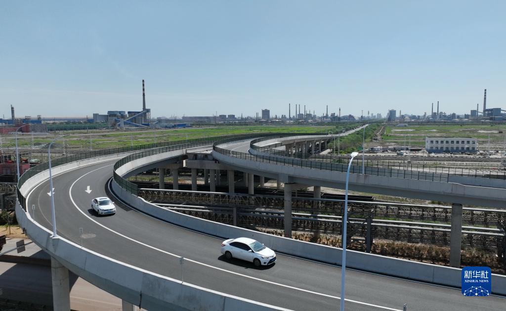 6月9日,车辆从河北省唐山市海港经济开发区文化大街跨铁路专线立交桥上通过(无人机照片)。
