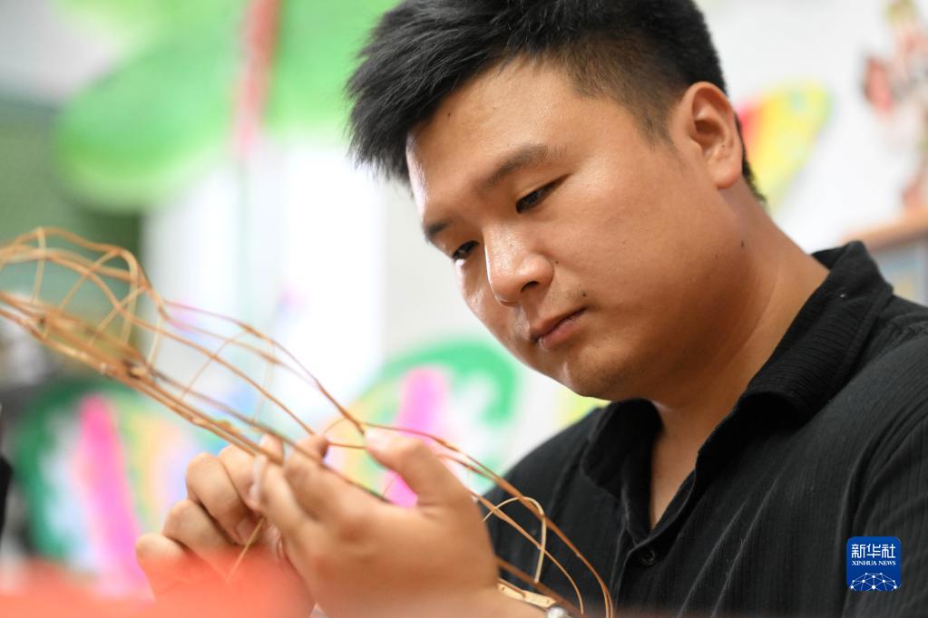 在天津市鼓楼附近的工作室里,魏博文在制作风筝骨架(6月8日摄)。