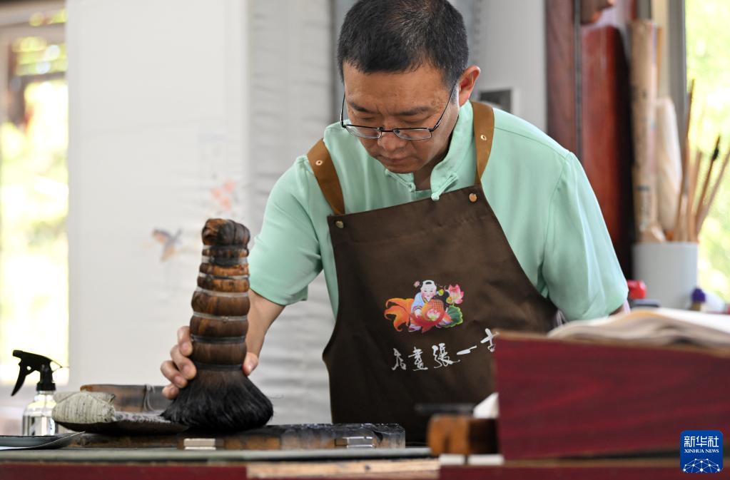 霍树林在天津市西青区的杨柳青霍氏古一张画店进行刷墨(6月6日摄)。