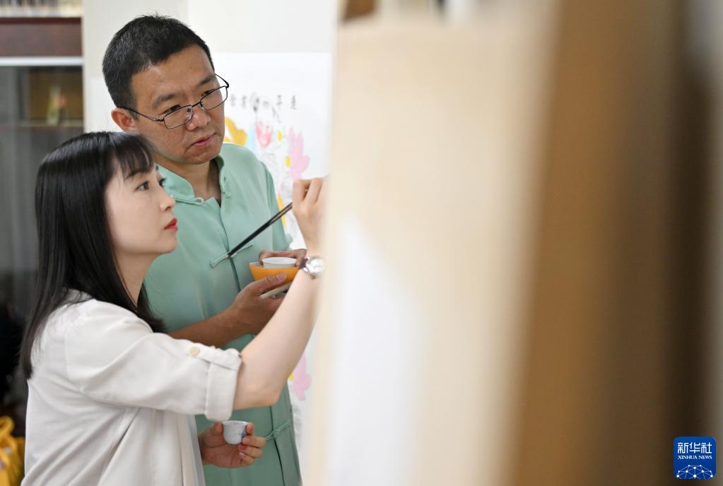 在天津市西青区的杨柳青霍氏古一张画店,霍树林(右)和妻子王丹一起进行彩绘(6月6日摄)。