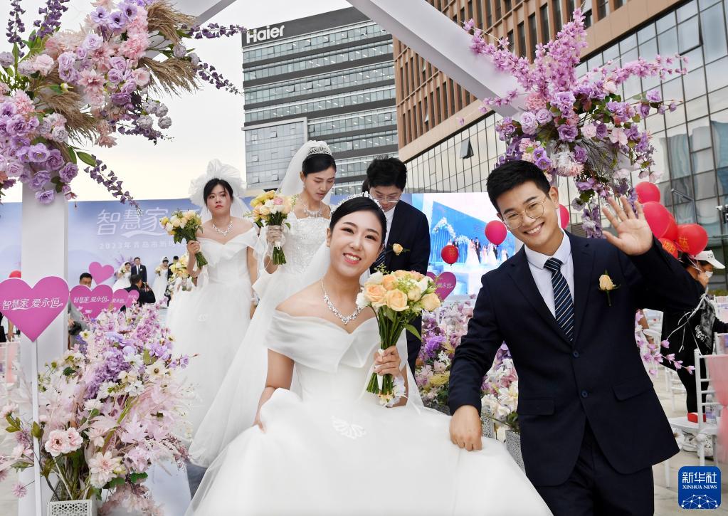 6月10日,新人们在青岛市崂山区海尔科创生态园新时代文明实践广场参加集体婚礼。