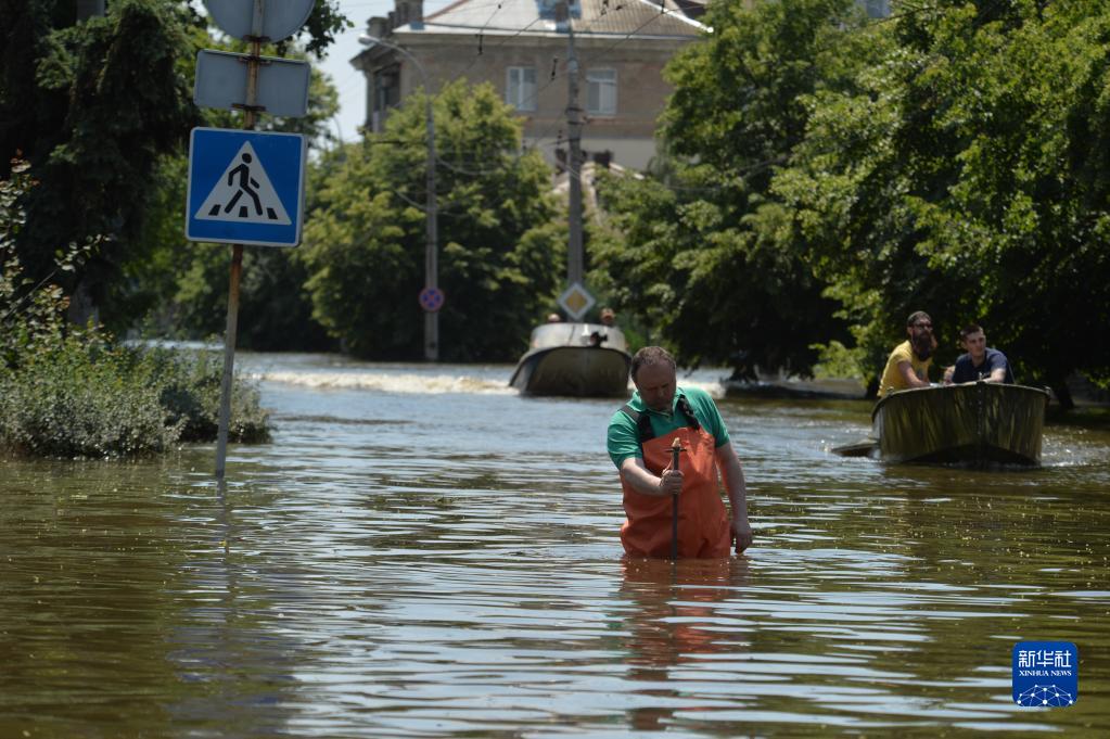 6月9日,一名水利工作人员在赫尔松市被洪水淹没的街道测量水位。
