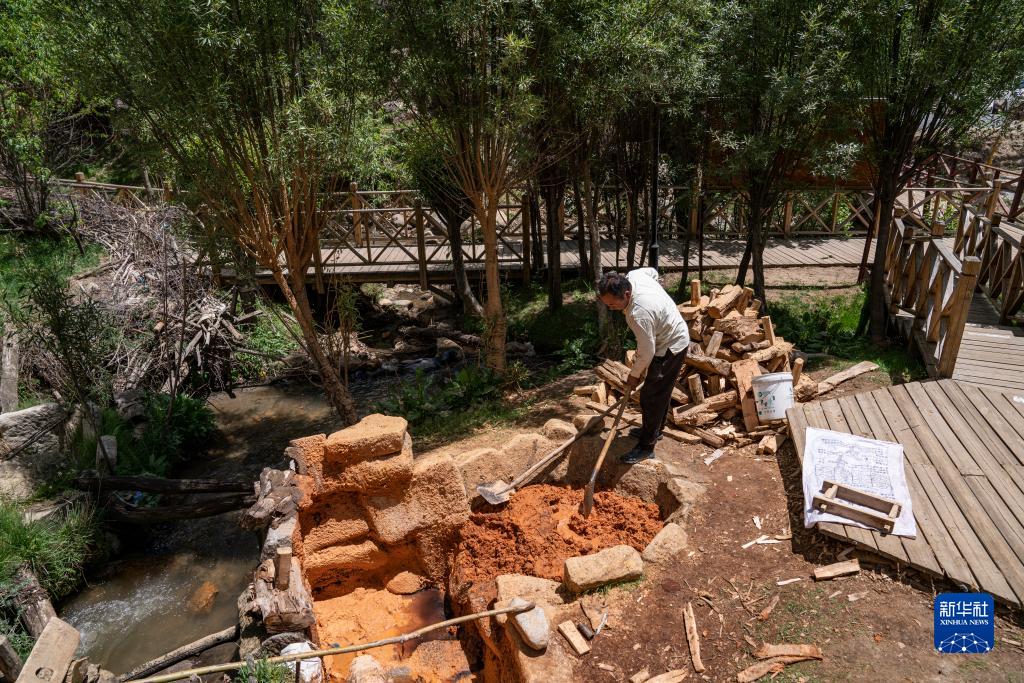 在西藏尼木县吞巴镇吞达村,次仁多吉将柏木浆制作成香砖(6月9日摄)。