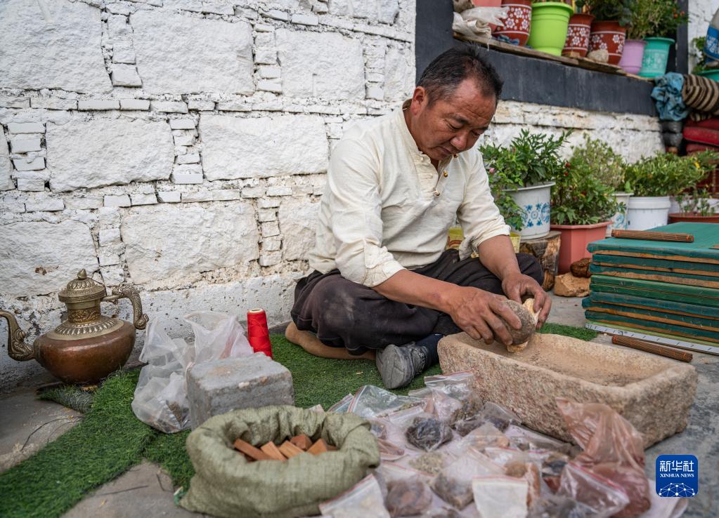 在西藏尼木县吞巴镇吞达村,次仁多吉在研磨药材和香料(6月9日摄)。