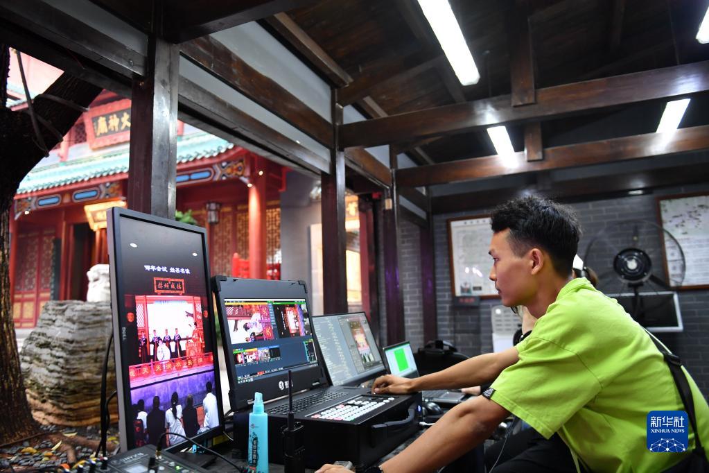 6月5日,在长沙市坡子街火宫殿,长沙市花鼓戏保护传承中心的直播团队在操作导播台。