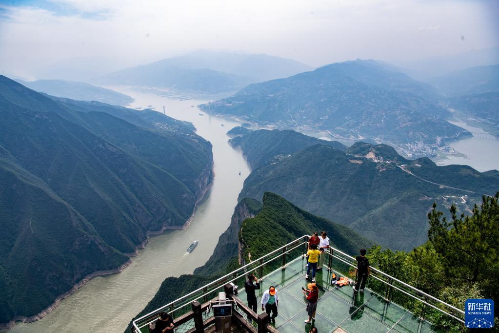 6月9日,在位于重庆市奉节县的旅游景点三峡之巅,游客在参观游览。重庆加强保护修复长江生态环境,秀美风光和厚重人文资源吸引了大量游客。今年以来,三峡旅游持续升温。