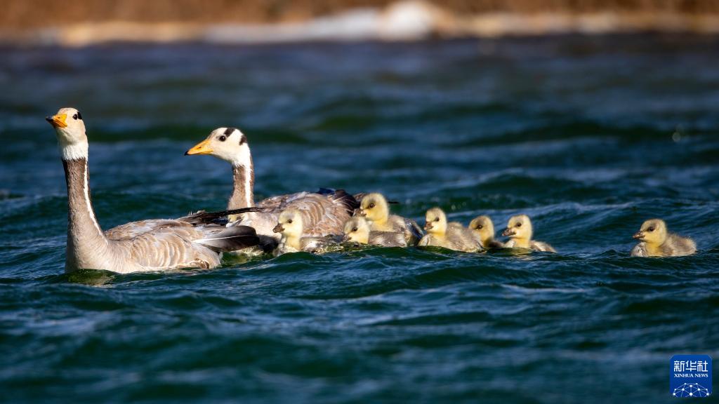 6月6日,在甘肃阿克塞哈萨克族自治县境内的小苏干湖湿地,斑头雁带领雁宝宝在水中活动。