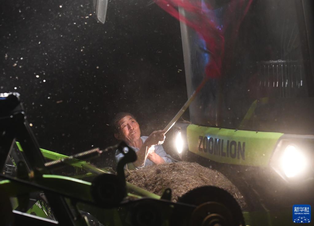 麦屑飞舞,烟尘四起。远远望去,在深夜的麦田里来回穿梭的收割机,像一团时大时小的“火球”在滚动。虽然视野远不如白天,但对于有着二十多年“驾龄”的村民袁荣鹏来说,没什么大不了。因此,村支部书记把最难收割的地块交给了他。