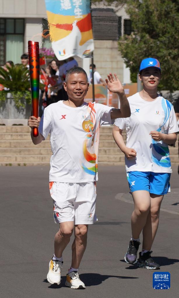 6月10日,火炬手刘时勇(左)在火炬传递中。
