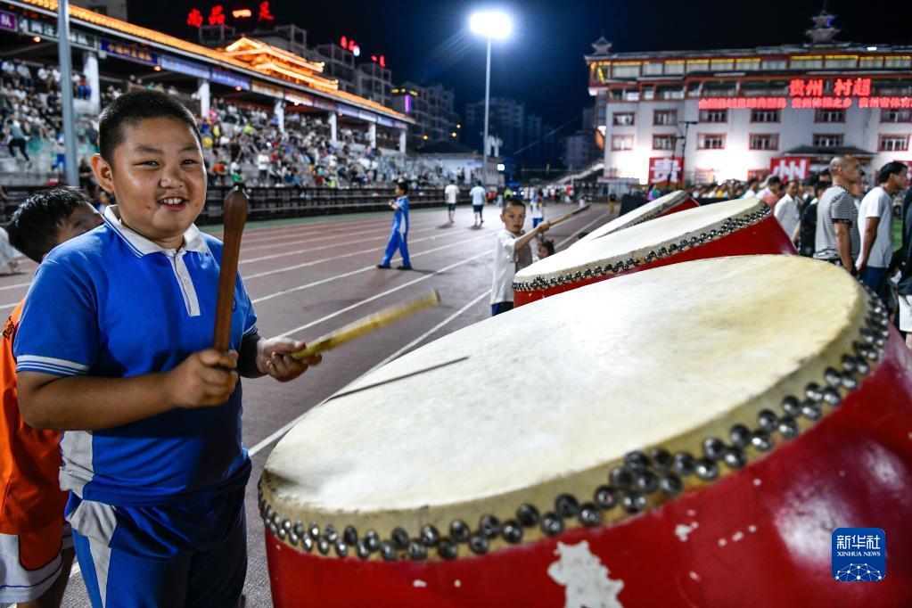 6月9日,一名小朋友在贵州“村超”足球比赛现场击鼓助威。