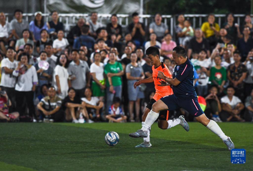 6月9日,新中村足球队球员(左)与凤凰村足球队球员在比赛中拼抢。