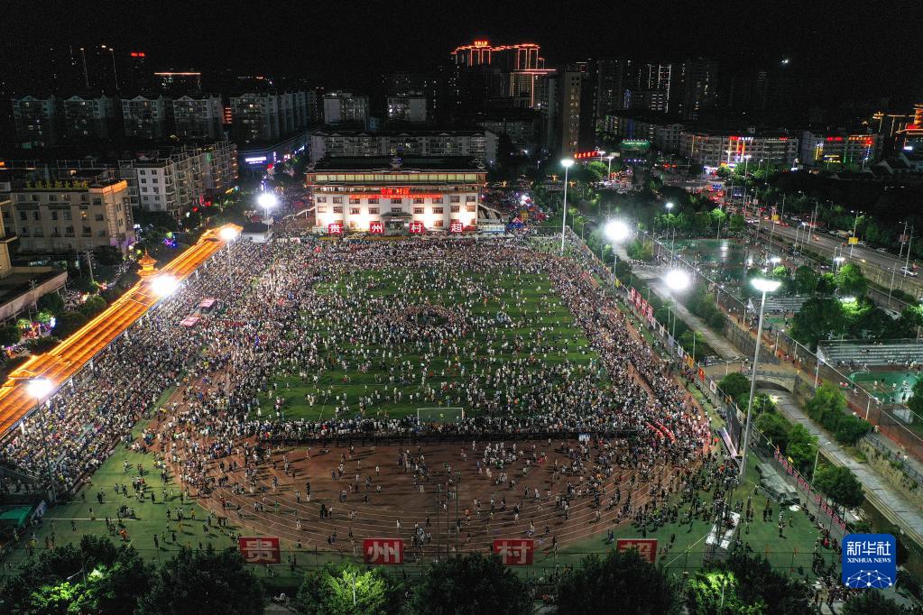 6月10日,演员在贵州“村超”足球比赛后表演民族舞蹈“多耶”,现场观众一起上场狂欢(无人机照片)。