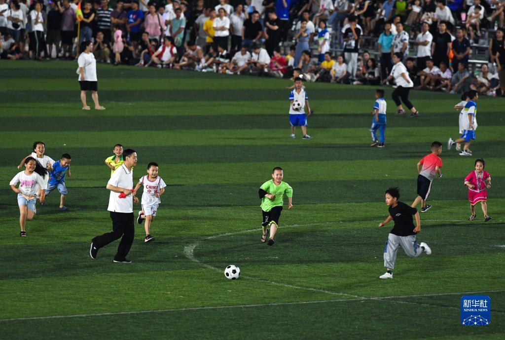 6月9日,小朋友们在贵州“村超”足球比赛半场休息时间上场踢球。