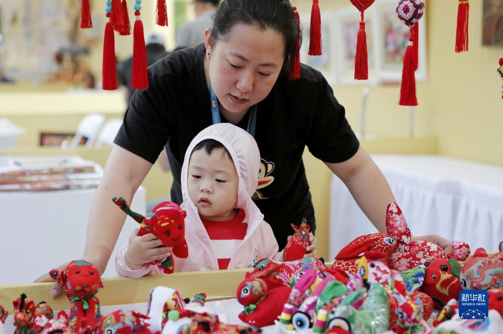 6月10日,在哈尔滨市索菲亚广场非遗工坊展,市民在了解传统手工布艺展品。