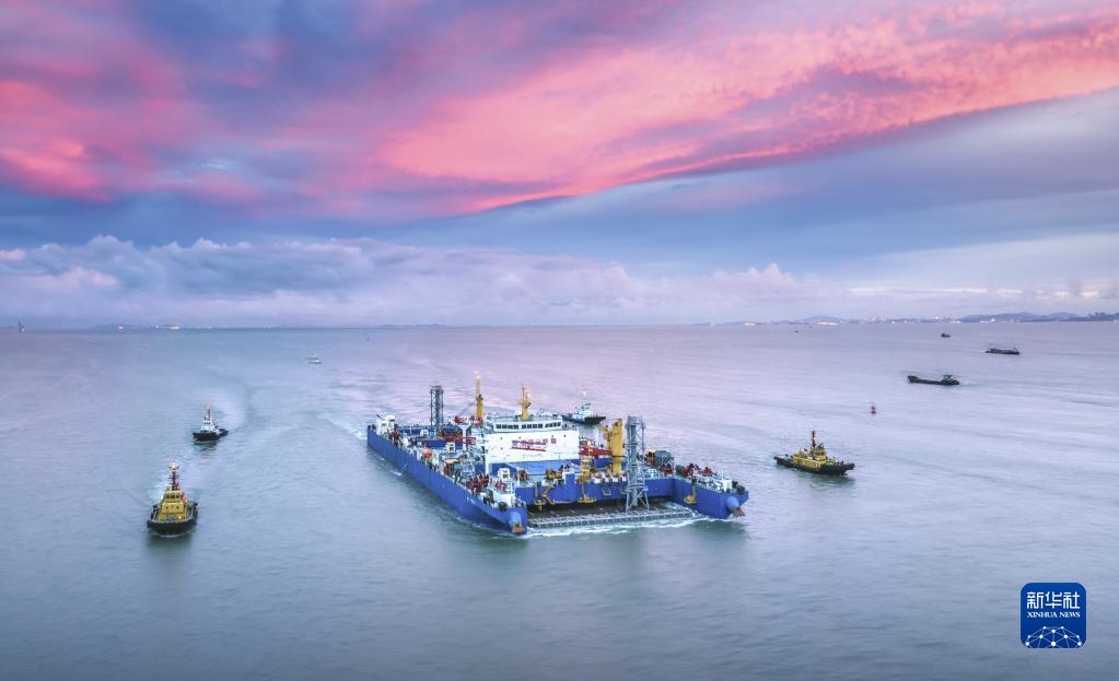 “一航津安1”号沉管运输安装一体船将E23管节和最终接头浮运至安装现场(无人机照片,2023年6月8日摄)。