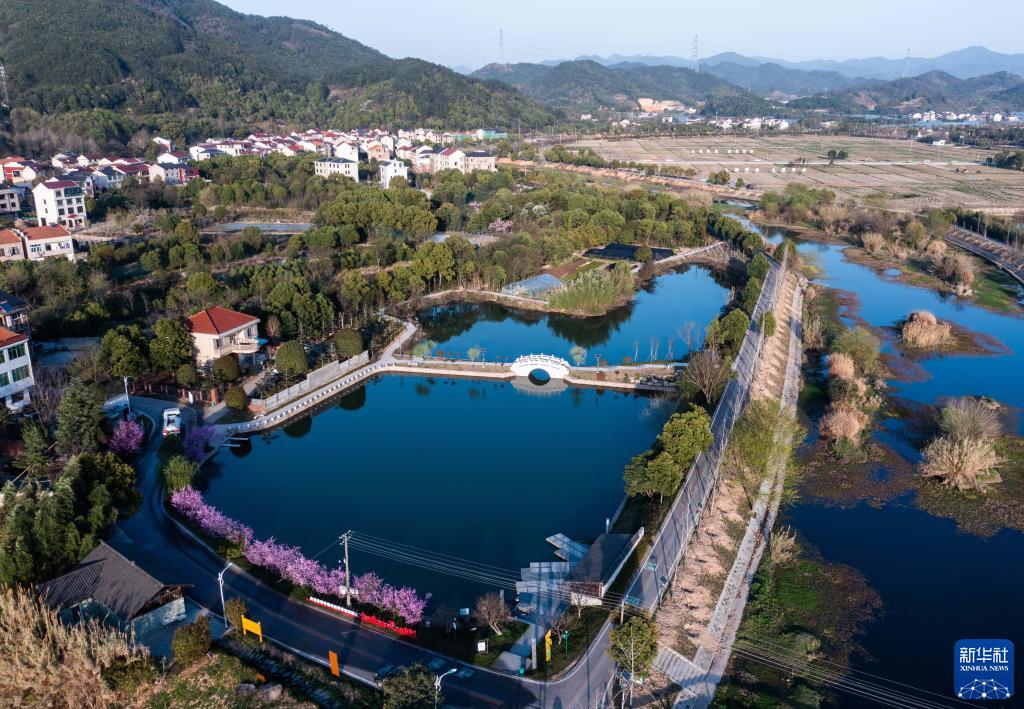 空中俯瞰浙江金华市金东区岭下镇八仙溪及周边村庄(3月14日摄,无人机照片)。近年来,岭下镇通过“抓源头、强整治、做项目、重长效”的治理思路,先后关停八仙溪沿岸多家制砂企业及养殖场,清理河道垃圾,完成28个村农村生活污水处理工程和51口池塘清淤,2018年以来八仙溪水质常年保持在Ⅱ类以上。