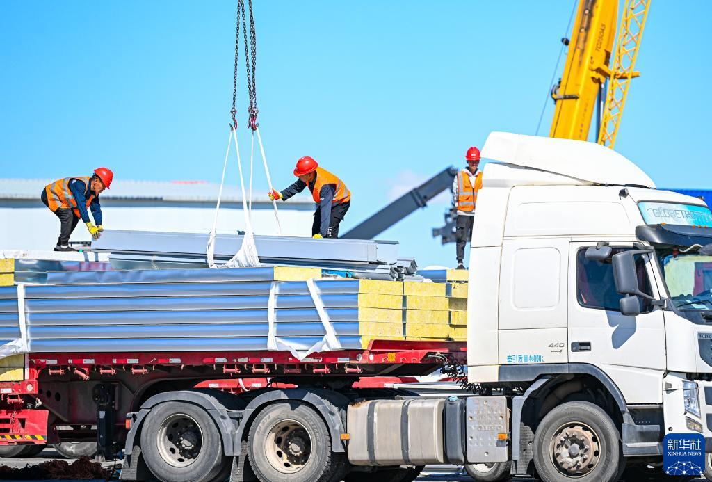 6月11日,工人在二连浩特口岸旁的进出口物流园区中装载准备出口的货物。